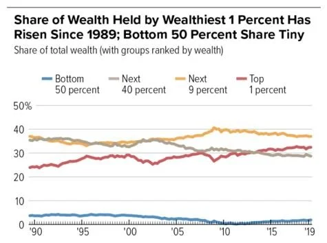 Data from the Federal Reserve’s Survey of Consumer Finances (SCF) is the main official source of data measuring the distribution of household wealth since 1989. As the following chart illustrates, since 1989, the share of wealth held by the top 1% has increased, while the share held by the other groups, has decreased.