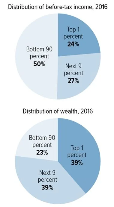 Not surprisingly, after tax incomes fell sharply across the board in 2008 and 2009 but have partially recovered. Although below its 2007 peak, the average income (after taxes and transfers) of the top 1% of households from 2009-2016 was nearly 5 times that of the middle 60%, and 2.5 times that of the bottom20%. The distribution of wealth (asset ownership) is even more highly concentrated at the top than is income and has been increasing since the 1980s.