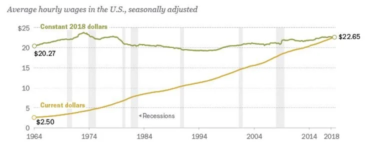 Note: Data for wages of production and non-supervisory employees on private non-farm payrolls. “Constant 2018 dollars” describes wages adjusted for inflation. “Current dollars” describes wages reported in the value of the currency when received. “"Purchasing power” refers to the amount of good or services that can be bought per unit of currency.
