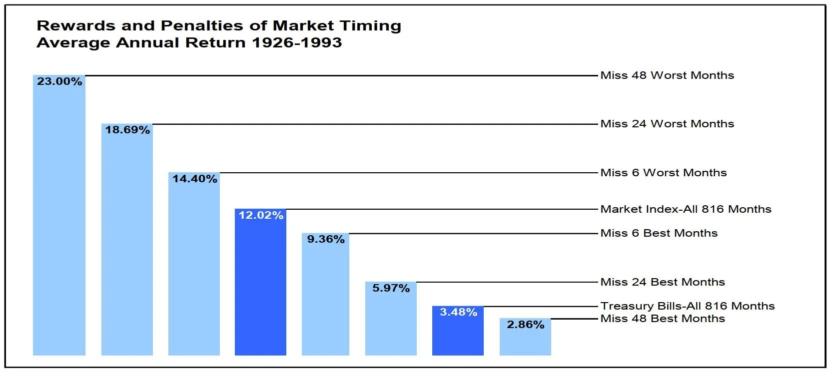 From 1926-1993, a capitalization weighted index of U.S. stocks gained an average of 12.02% annually. An initial investment of $1.00 in 1926 would have earned a cumulative $637.30. If an investor missed the market's best 12 of the 816 months, the annual return falls to 8.07% and the cumulative earnings to $65.00. Missing the best 48 months, or 5.9% of all months, reduces the annual return to 2.86% and the cumulative gain to $1.60.
