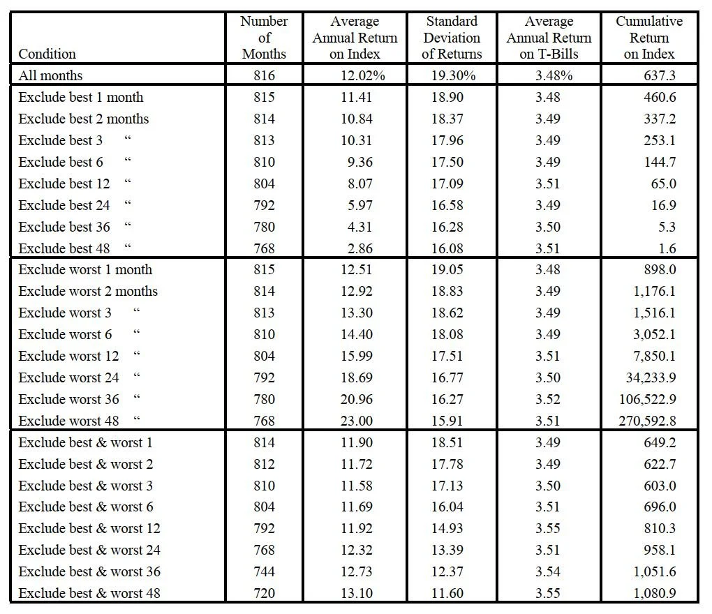 The study found that by being "out of the market" for just a few months during this 68-year period, the risk and reward of the index changes dramatically if the months which were missed were those with either the highest or lowest returns - that is, the best or the worst.