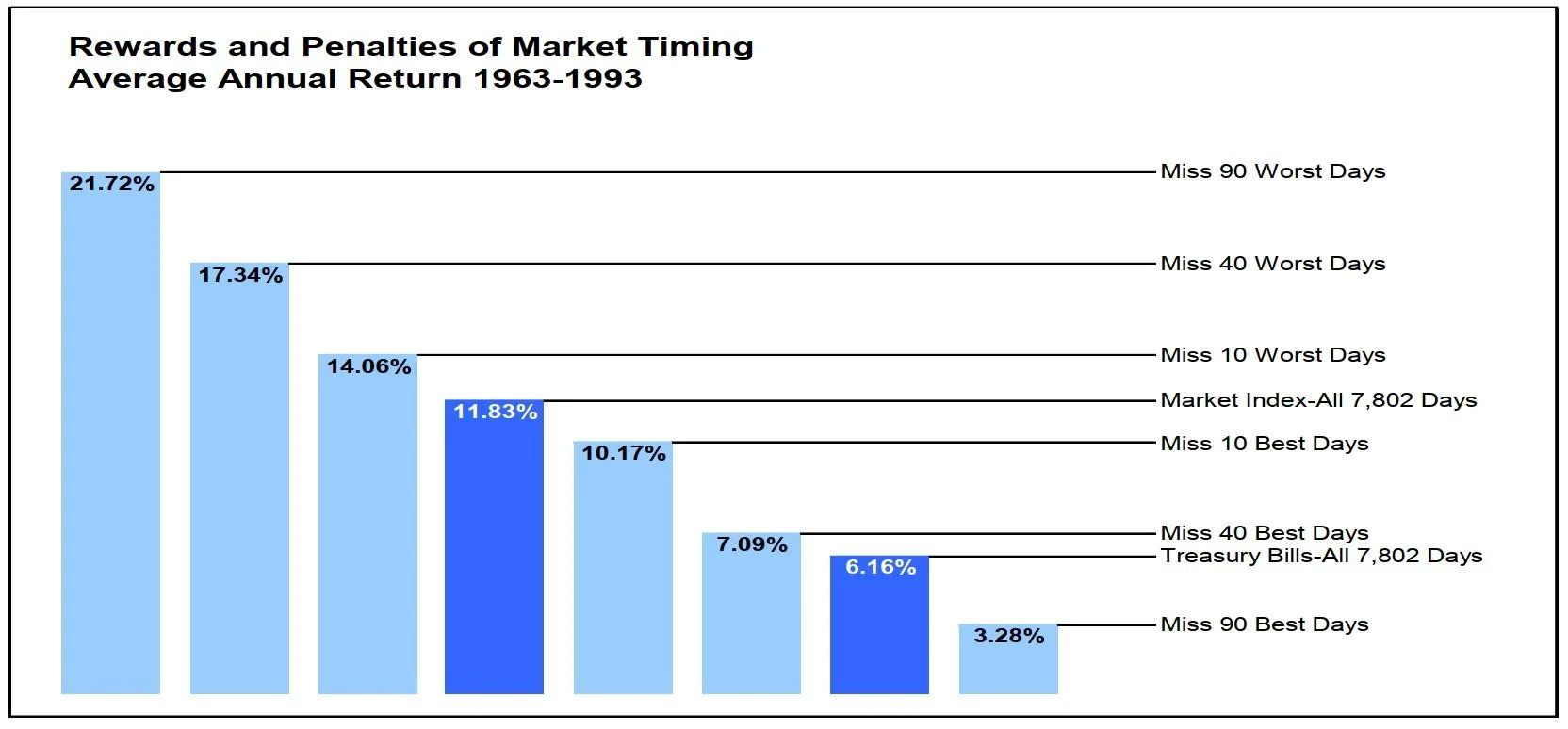 In the 1963-1993 span, missing the best 0.8% of the days (a total of 60 days in all) created an exposure to 94% of the risk of continuous stock market investing. In this situation, the average annual return would have been 11% less than that of Treasury bills.