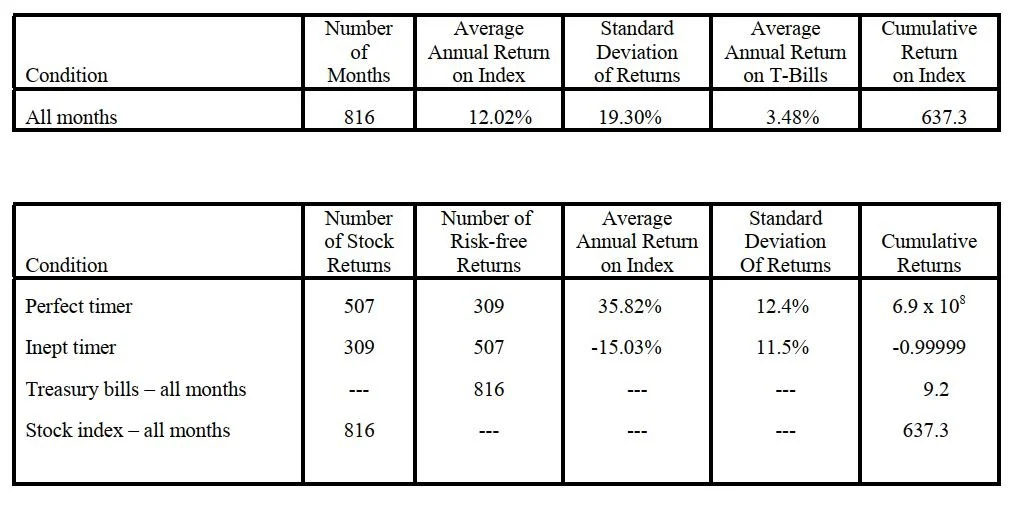 The financial results of perfect timing are indeed attractive. Yet they are virtually unreachable. In terms of the monthly data, for example, if a market timer is right 50% of the time, the probability of executing a perfectly timed investment strategy is 0.5 raised to the 816th power -- or nearly zero.