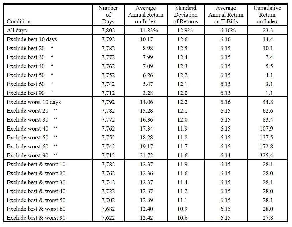 For the entire 31 years of daily data, the index had an average annual return of 11.83% and a cumulative gain of $23.30 on $1.00 invested at the start of the period. Excluding the 10 best trading days, or one-tenth of one percent (0.1%) of the total, reduces the average annual return to 10.17% and the cumulative gain to $14.40 -- a reduction of 38%.